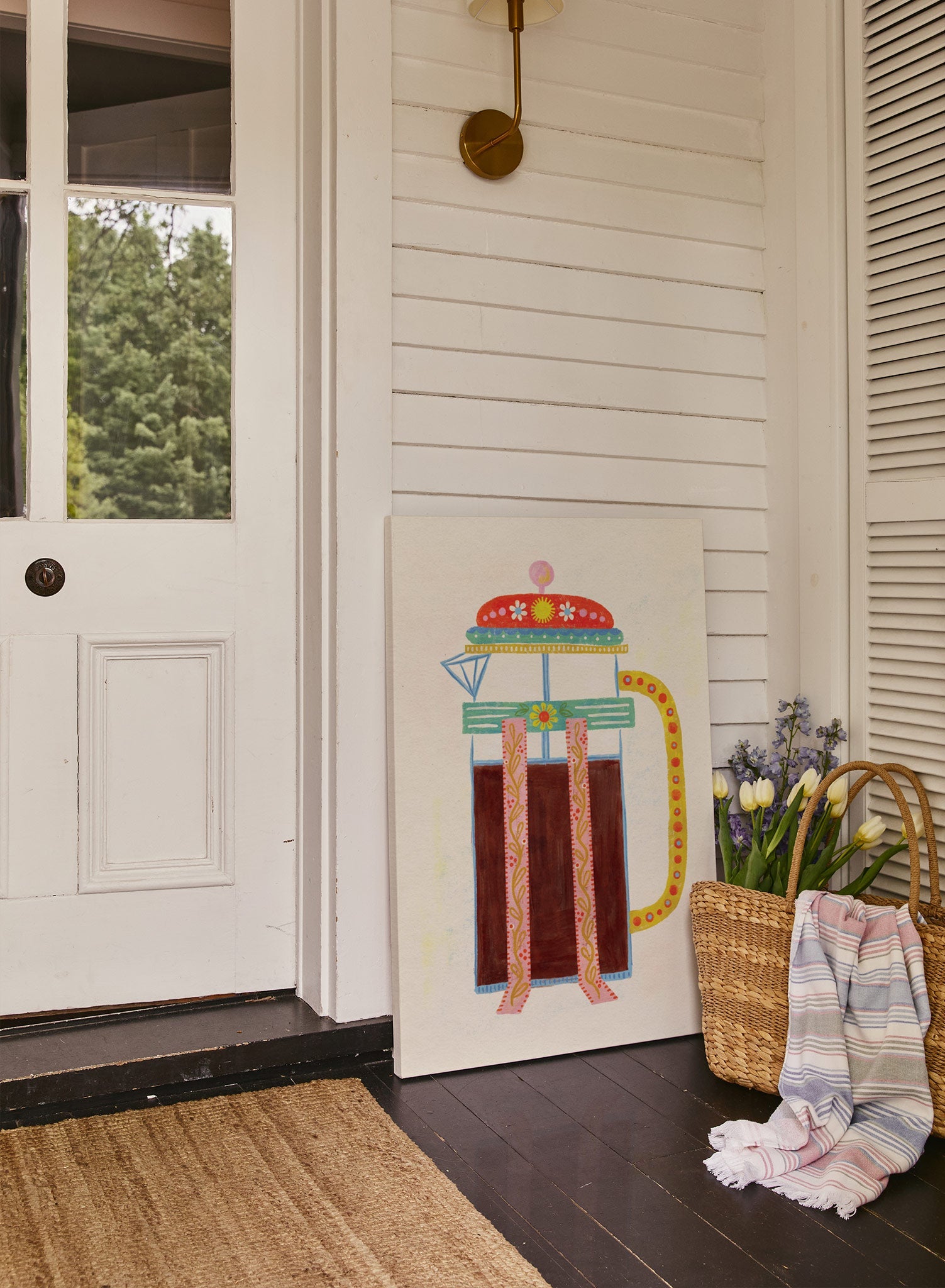 Kenzie Elston’s signature maximalist joy shines in this close-up of a whimsical French press, decorated with ornate borders and topped with a cherry-red lid that looks almost celebratory. Every detail, from the floral knob to the patterned handle, feels thoughtfully placed.