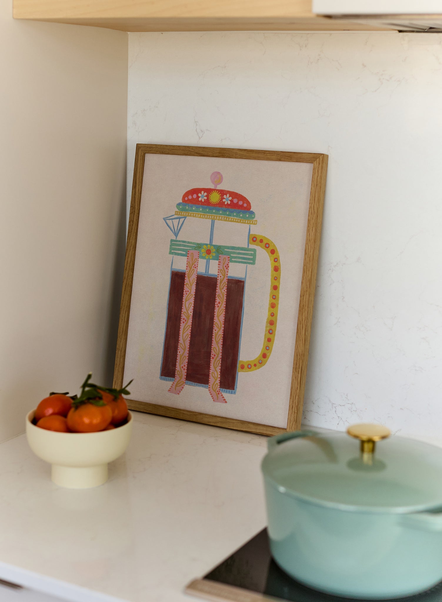 Try it above a coffee station or pair it with other kitchen-themed prints for a cheerful, cottage-inspired wall moment.